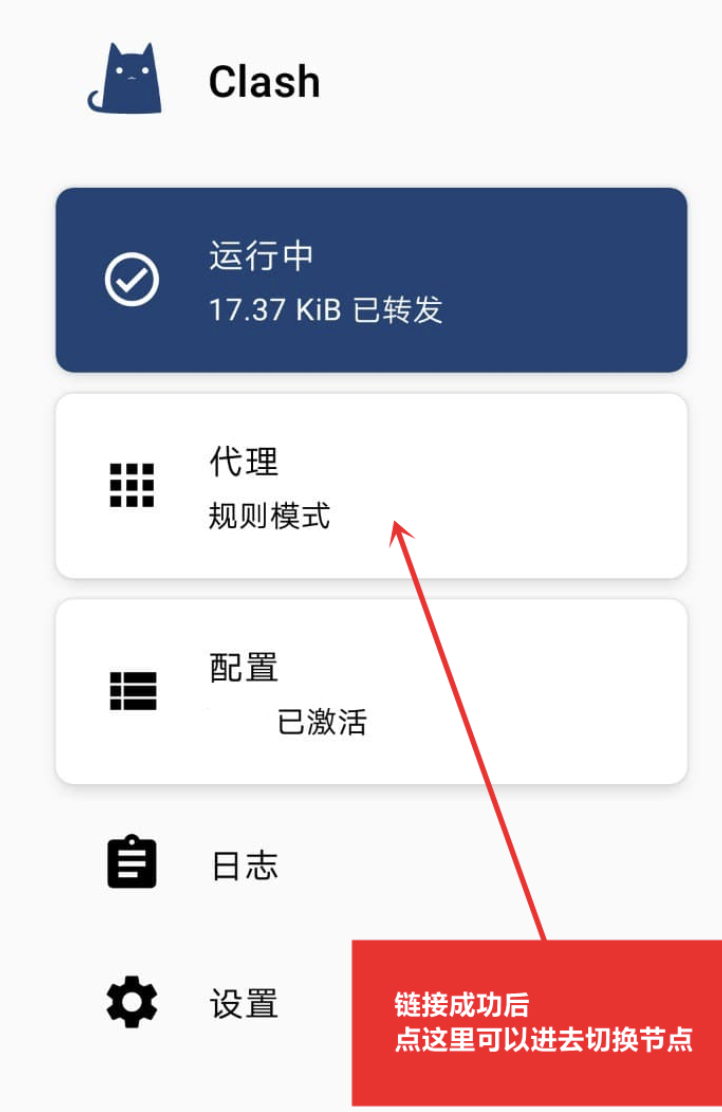 链接成功后就如下图所示,然后就可以进去代理界面去选择您想使用的节点了