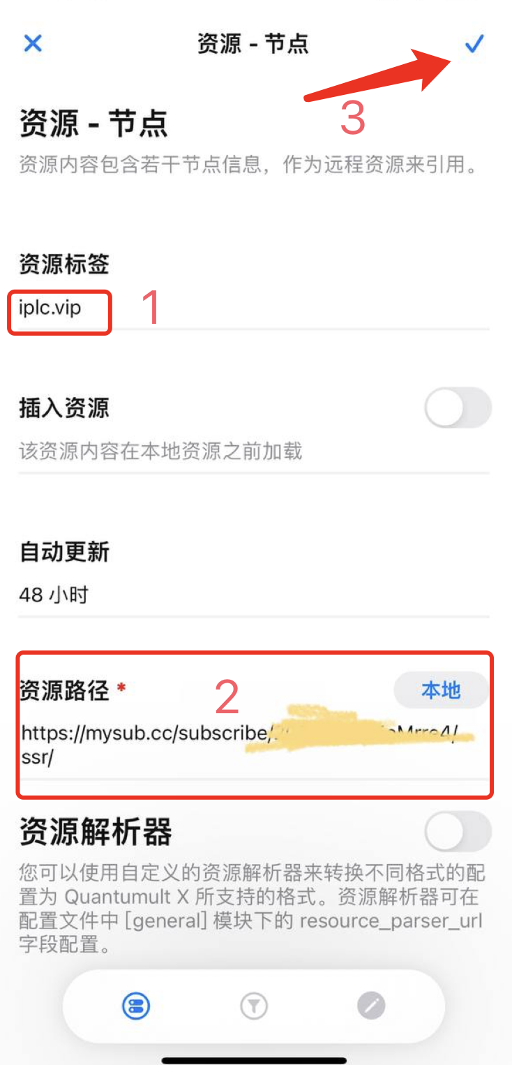 五:进入页面后可以给资源添加一个标签(可选),然后把在第一步里复制来的ssr订阅地址黏贴到“资源路径”,完成后点右上角的“√”标识。等待更新出节点。
