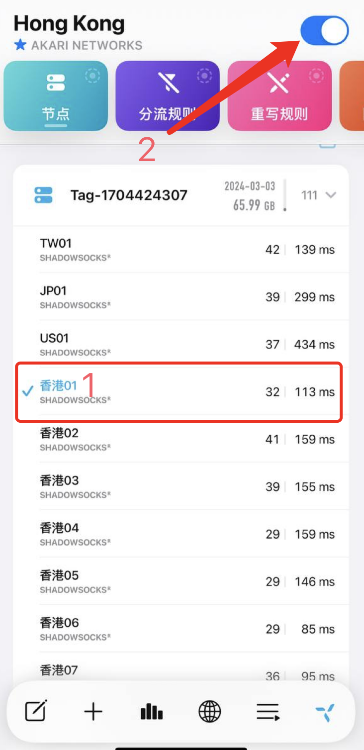 六:回到软件主页,选择想要使用的节点,右上角的按钮为代理开关。